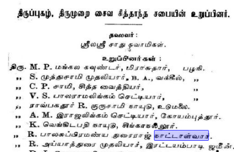கள்ளர் மரபை சேர்ந்த பழநித் தல வரலாறும் திருக்கோயில் வழிபாடும் என்னும் நூலில் திருப்புகழ் , திருமுறை சைவ சித்தாந்த சபையின் உறுப்பினர்களில்